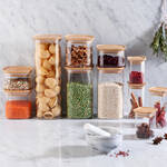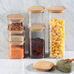 Luftdicht verschließt der natürliche Bambusdeckel mit dem abnehmbaren Silikonring die Vorratsbehälter aus Borosilikat-Hartglas. Darin werden trockene Lebensmittel wie Pasta, Müsli, Hülsenfrüchte, Zucker, Kaffee etc. gut sichtbar aufbewahrt und bleiben sauber und aromatisch frisch. Durch die quadratische Grundfläche wird der Platz im Küchenschrank oder in der Schublade optimal ausgenutzt. Mehrere Glas-Behälter lassen sich beliebig zusammenstellen oder stapeln.