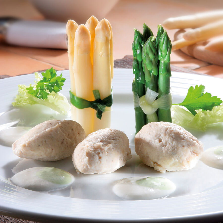 • Produktbild für 'Pochierte Poulardenklösschen mit Spargelbündeln auf Spargelcreme'
