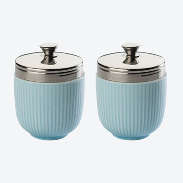 Inhalt 150 ml, Ø 6,5 cm, 9 cm hoch, Hartporzellan in elegantem Streifen- Reliefdekor, Edelstahldeckel.