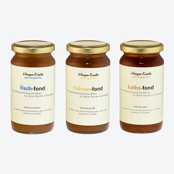 Kalbsbrühe (Wasser, Kalbsknochen, Zwiebeln, Lauch, Karotten, Sellerie, jodiertes Speisesalz (Speisesalz, Kaliumjodat)), Weißwein (enthält Sulfite), Zucker, Rindfleischextrakt, Gewürze.