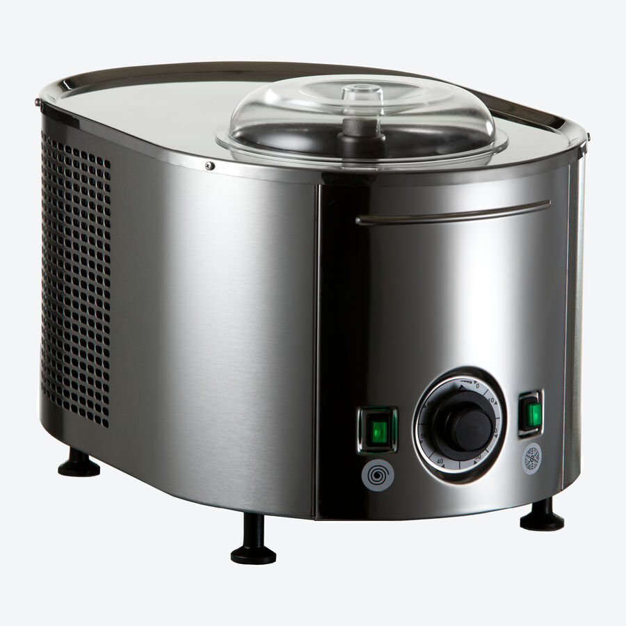 Diese original italienische Kompressor-Maschine produziert unvergleichlich cremiges Eis. Dank des kraftvollen Motors und dem hochwertigen Rührwerk wird das Speiseeis auf dem Niveau professioneller Eisdielen zubereitet. Die einzelnen Eiskristalle sind dabei so fein, dass sie selbst für anspruchsvolle Genießer nicht spürbar sind. Völlig einfach ist die Zubereitung. Mit dem Drehregler wird die Zeit eingestellt und die Maschine gestartet. In 30-40 Minuten (je nach Rezept) sind 750 ml köstlichstes Speiseeis fertig zum Genießen. Ausgestattet mit Timer- und Pulse-Funktion, Kontrollleuchte und Überhitzungsschutz.