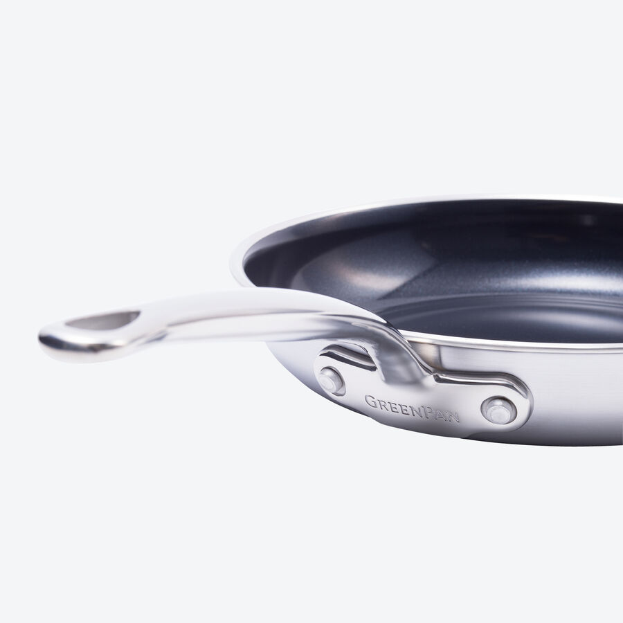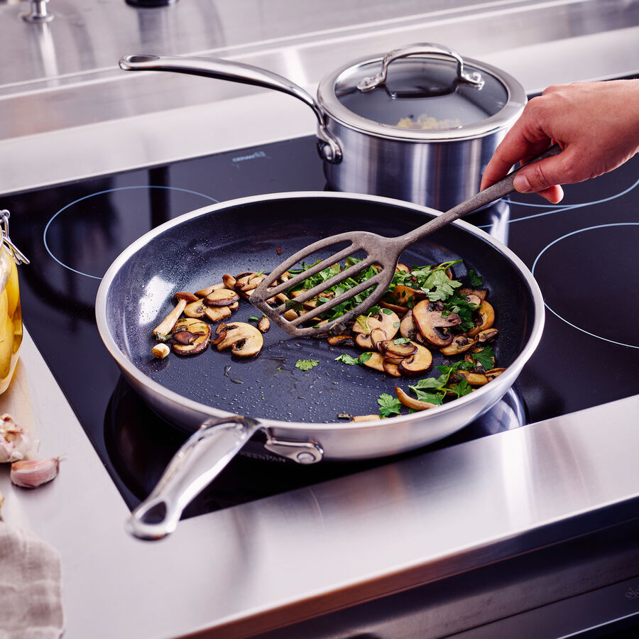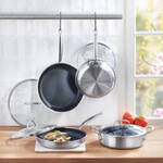 Dank der absolut gleichmäßigen Wärmeverteilung des hochwertigen 3-Lagen-Edelstahls mit Aluminiumkern sind beste Bratergebnisse garantiert. Jegliches Anbacken unterbindet die patentierte, natürliche keramische Antihaftbeschichtung. Veredelt mit Diamantkristallen ist sie besonders kratzfest, langlebig und widerstandsfähig. Im Gegensatz zu vielen herkömmlichen Beschichtungen ist sie zudem völlig frei von schädlichen Stoffen wie PFOA, PFAS, Blei und Cadmium. Selbst bei Überhitzen entstehen keinerlei giftige Dämpfe. Vor Stößen und Abplatzungen der Beschichtung schützt der gewickelte Edelstahlrand. Geeignet auch zur Verwendung von Metall-Kochutensilien.