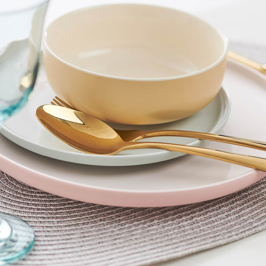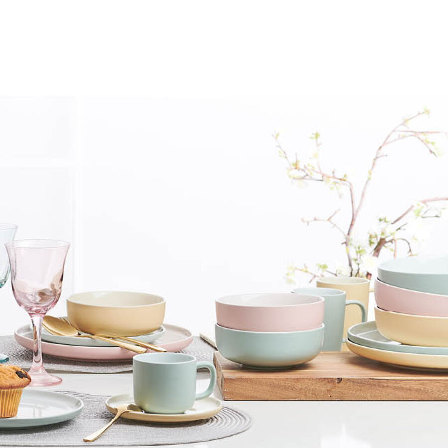 Mit ihrer Schlichtheit erinnern die gradlinigen Formen an den skandinavischen Stil, der die typische "Hygge" Gemütlichkeit ausstrahlt. Das klar designte Geschirr mit feiner Textur und frischer Farbgestaltung in Rosa, Mintgrün oder Vanillegelb wird in seiner Wirkung noch durch den edlen Kontrast der Glasur unterstützt. Die Innen- und Oberseiten der Essteller sind mit einer Glanzglasur veredelt, Außen- und Unterseiten haben eine Mattglasur und geben ihnen damit einen warmen, angerauten Soft-Touch. Decken Sie Ihre Frühlingstafel in den harmonischen Farben und beeindrucken Sie Gäste mit dem romantisch angehauchten Retro-Look.