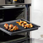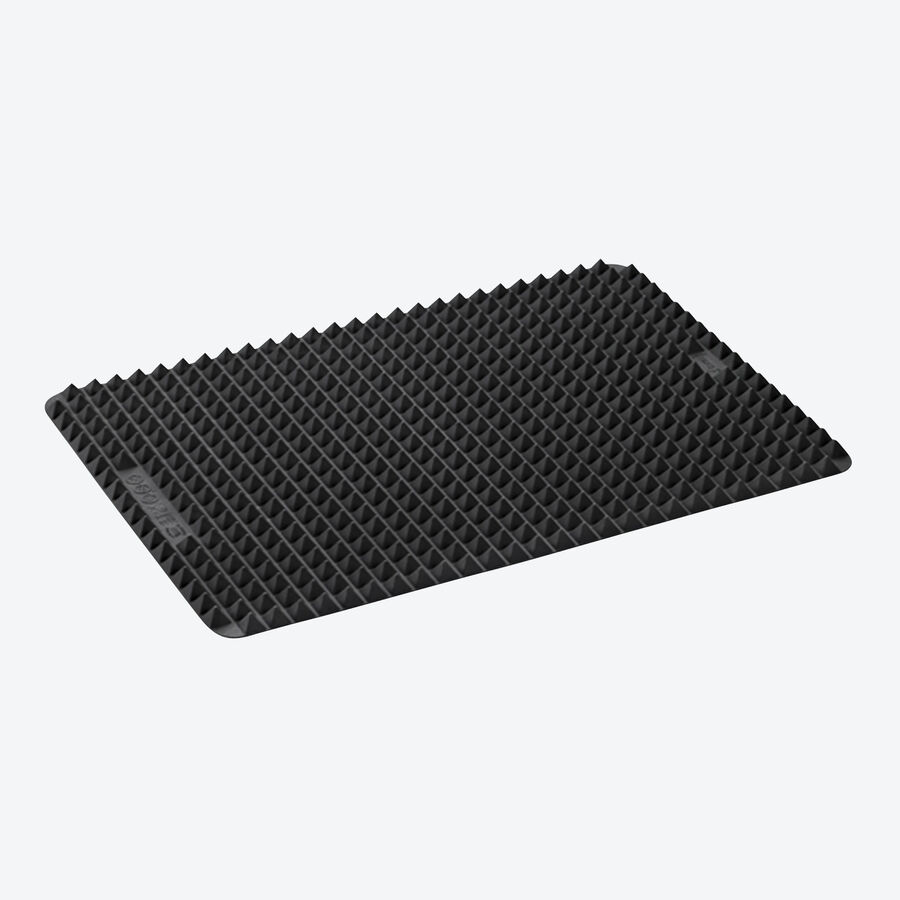 Von allen Seiten für die Ofenhitze frei zugänglich ruhen Geflügel, Fleisch, Fisch, Pommes frites, Ofenkartoffeln auf 556 kleinen, 1 cm hohen Pyramidenspitzen. Frei und ungehindert zirkuliert die Hitze beim Backen. Nichts köchelt im eigenen Saft anstatt zu braten, herabtropfendes Fett oder austretender Fleischsaft laufen in Saftrillen ab. So entsteht ringsherum eine wohlschmeckende, knusprige Bratkruste. Lästiges Wenden ist ebenso überflüssig wie das Einfetten, nichts haftet darauf oder brennt ein. Die Matte wird einfach auf das Backblech gelegt und ersetzt übliches Backpapier. Auch als Unterlage bei der Pralinenfertigung, für Teig bei der Gebäckherstellung oder dem Kuvertüre-Überzug nützlich.