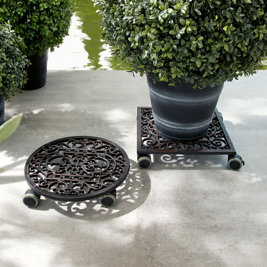Diese stilvollen gusseisernen Pflanzenroller sind nach jahrhundertealter Handwerkstradition gefertigt. Per Hand gegossen, bestechen sie durch rustikalen, antiken Charme. Kübelpflanzen bis zu 90 kg Gewicht bewegen Sie auf den stabilen, leichtgängigen Kunststoffrollen mühelos von drinnen nach draußen. Auch beim Putzen sind die Pflanzen, ohne Ihre kostbaren Böden zu verkratzen, rasch zur Seite gerückt. Nicht rostfrei. Der Witterung ausgesetzt, verleiht Oxidation dem Gusseisen ein attraktives Antikfinish. 4,5 cm hoch, wiegen 2,2 kg.