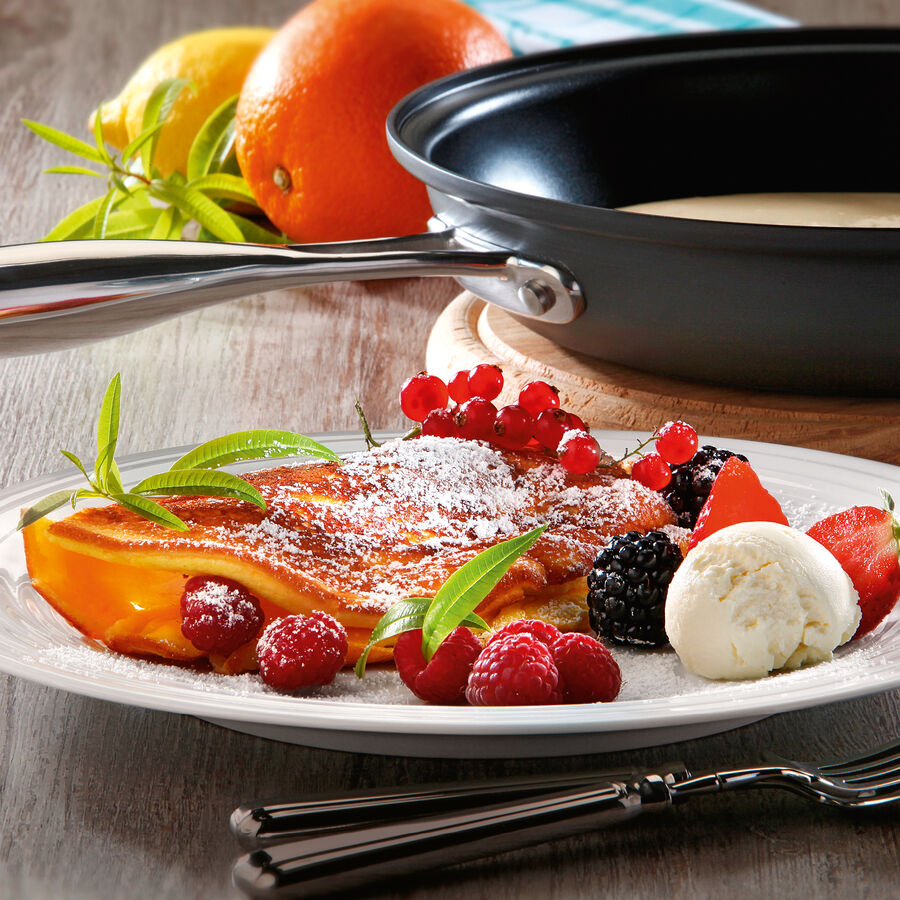 Das Omelett zusammengeklappt mit der schön gebräunten Seite nach außen auf Tellern anrichten. Alles mit etwas Puderzucker einstäuben und verschiedene Beeren und eine Kugel Eis dazu komponieren.