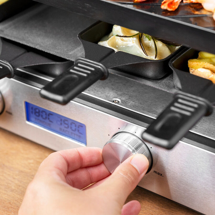 Die vielfältigen Möglichkeiten dieser meisterhaften Dreifach-Kombination genießen bis zu 9 Personen gleichzeitig. Jeder Gast der Tischrunde darf individuell sein Lieblingsgericht zubereiten. Mit getrennten, stufenlosen Reglern steuern Sie Raclette, Tischgrill (150-280 °C) und Fonduetopf (40-180 °C). Da auch im niedrigen Temperaturbereich eine präzise Steuerung möglich ist, eignet sich das Kombigerät ideal für Fleisch-, Käse-, Brüh- und Schokoladenfondue. Eine zusätzliche Ebene zum Abstellen und Warmhalten der Pfännchen schafft Platz auf dem Tisch.