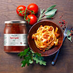 Reh-Ragù verfeinert mit Wein, Wacholderbeeren, Salbei. Ein Genuss zu Pappardelle- oder Linguine-Bandnudeln. Rein natürliche Zutaten, ohne jegliche Farb- und Konservierungsstoffe.