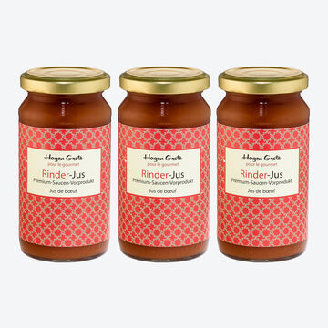 Für intensive, hocharomatische Fleischsaucen ist Jus (französisch = Saft) die klassische Basis der Spitzenküche. Viel kraftvoller und aromatischer als Fond entsteht sie in aufwendiger Herstellung aus angerösteten Fleischknochen, Röstgemüse und viel Fleischfond. In ca. zwölfstündiger (12!) Kochzeit werden die aromatischen Geschmacksstoffe aus Fleischsaft und Röstaromen immer stärker konzentriert. Es wird mehrfach abgeschäumt und je nach Fleischsorte mit Weiß- oder Rotwein aromatisiert. Nach dem Erkalten wird das ausgetretene Fett entfernt. Zur Fertigstellung kann eine klassische Bindung mit untermontierter Butter, Mehl, Mehlbutter oder Speisestärke erfolgen. Je nach Verwendung wird die Sauce mit Sahne, Alkohol (z. B. Portwein, Cognac, Noilly Prat), Kräutern und Gewürzen verfeinert. Ebenso köstlich ist Jus als Basis von Ragouts und gemischt mit Gemüse, Pilzen oder Geschnetzeltem. Unsere Jus entsteht als Saucenbasis für die gehobene Küche nach höchsten Standards in klassisch handwerklicher Herstellung. Nur rein natürliche Zutaten ohne jegliche Farb- oder Konservierungsstoffe.