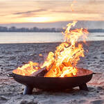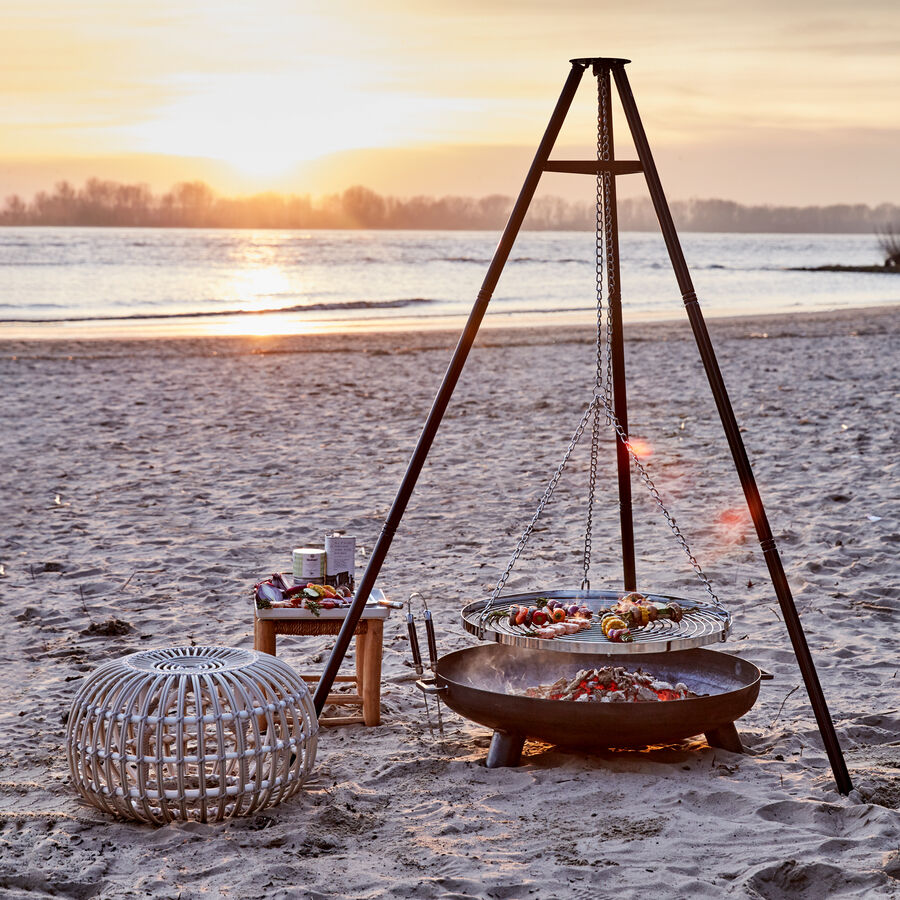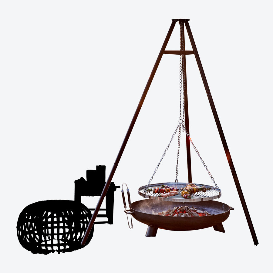 In der großen Feuerschale lässt sich mit Holz ein lebendiges Lagerfeuer entfachen oder Grillkohle entzünden. Blitzschnell geht der Umbau von wärmender Feuerstelle zum perfekten Grill. Fest und sicher steht der Dreifuß über der Glut. Die ideale Grillrosthöhe wird per Kettenzug reguliert.