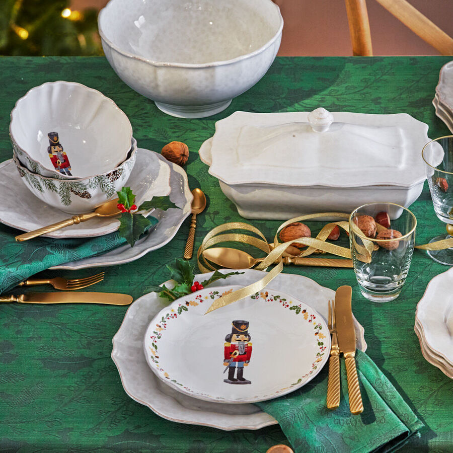 Als Inspiration für das hübsche Design dieser hochwertigen Salat- und Dessertteller dient die Traditionsfigur des Nussknackers. Die edlen Teller lassen sich mit jedem beliebigen weißen Service festlich kombinieren. So stellen sie eine schöne, weihnachtliche Ergänzung dar. Der Ursprung des Nussknackers, ursprünglich auch "Nussbeißer" genannt, reicht bis ins 17. Jahrhundert zurück. Als König, Soldat, Polizist oder Förster repräsentierten sie eine bärbeißige Obrigkeit, an der zur damaligen Zeit keine direkte Kritik geübt werden durfte. Heute gehören die seit langer Zeit im Erzgebirge hergestellten, ursprünglich aus Berchtesgaden stammenden Nussknacker traditionell zur Vorweihnachtszeit.