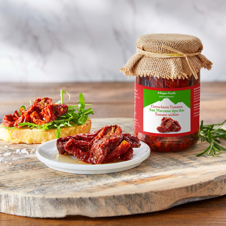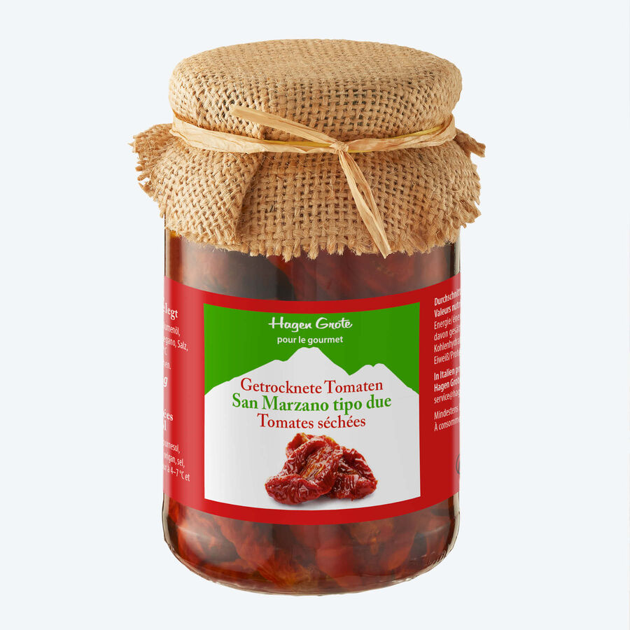 Mit Oregano, Chili und Kapern abgeschmeckt werden sie exklusiv für Hagen Grote in kalt gepresstem Pflanzenöl konserviert. Rein natürlich, frei von jeglichen Farb- und Konservierungsstoffen.