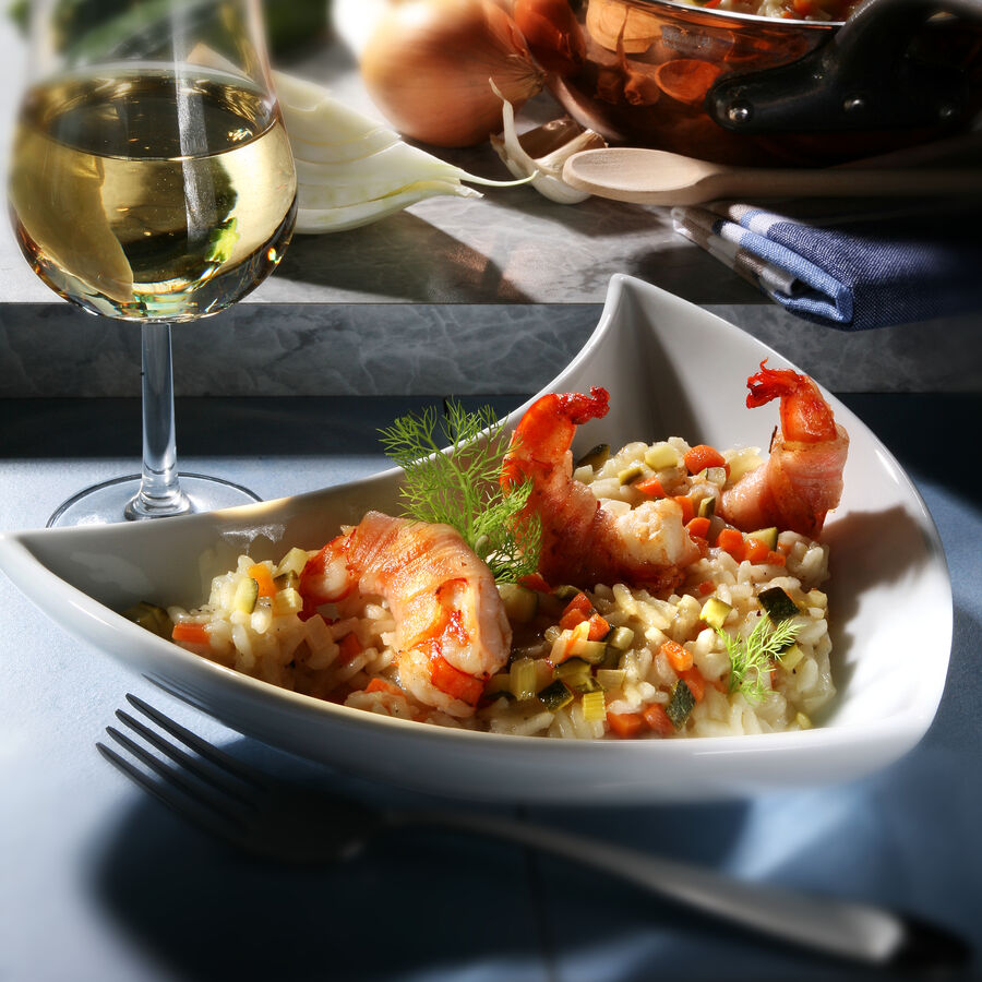 2 Olivenöl in einem Topf erhitzen und die Gemüsewürfel darin hell andünsten. Den Reis zufügen und ständig umrühren, bis die Körner glasig sind. Mit Weißwein ablöschen und vollständig verdampfen lassen. Knoblauch zufügen und die heiße Geflügelbrühe angießen. Den Risotto 15 Minuten kochen und gelegentlich umrühren, damit nichts ansetzt.
