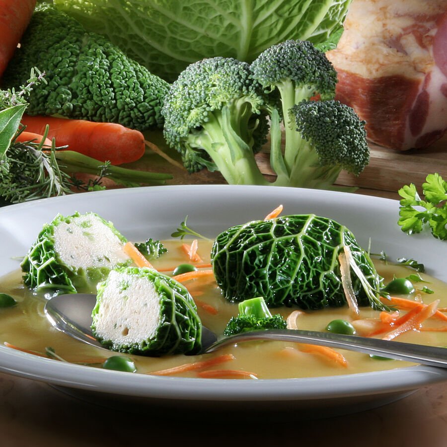 • Produktbild für 'Schinkensuppe mit jungem Gemüse und Wirsing-Hackfleisch-Bällchen'
