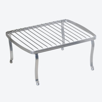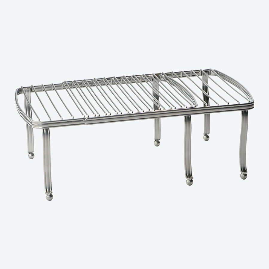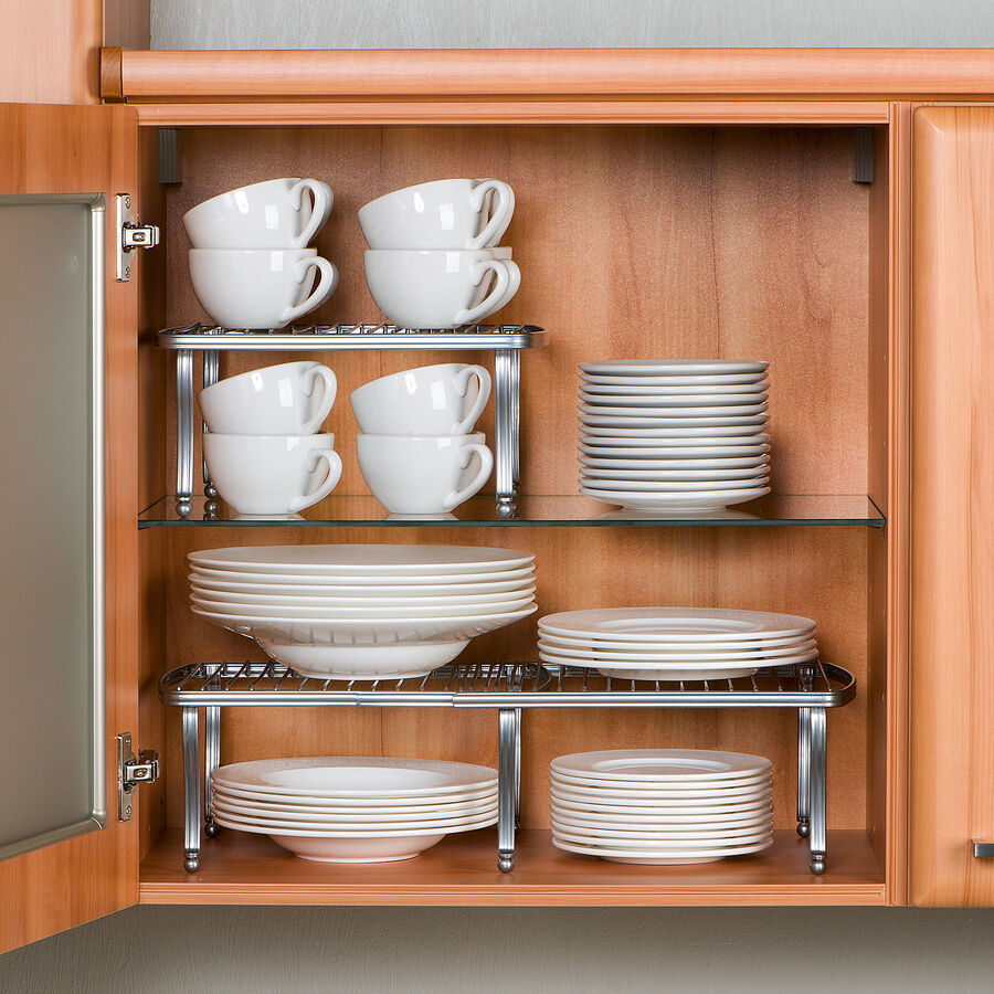 Der kleine und der große ausziehbare Schrankeinsatz aus beschichtetem Metall sind je bis zu 20 kg belastbar. In Schränken, Fächern, Schubladen, auf der Arbeitsfläche und im Vorratsbereich verdoppeln Sie damit Ihre Stau- und Ablagefläche. Viele Gläschen und Dosen der Gewürzabteilung nehmen die stabilen Einsätze ebenso auf wie Geschirr, Gläser, Handtücher oder Lebensmittel-Vorräte. Runde Füße verhindern Kratzer auf allen Oberflächen.