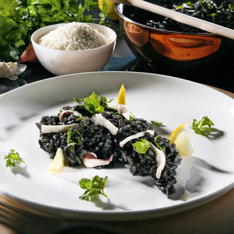 Die spanische "paella negra" bereitet man nahezu genauso zu. Statt der Schalotte werden 1 große Zwiebel und zusätzlich 2 längliche, spitze grüne Paprika in Würfeln, 1 gehackte Tomate und doppelt so viel Knoblauch verwendet. Die "paella negra" wird im Gegensatz zum Risotto nicht umgerührt. Durch die besonders flache Form der Paella-Pfanne verkocht die Flüssigkeit stärker. Dadurch ist eine "paella negra" wesentlich trockener als ein Risotto.