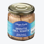 Unendlich groß ist der Geschmacksunterschied zum üblichen großen roten Thunfisch. Viel aromatischer, zart und fein im Geschmack ist der kleine weiße Angelthunfisch. In nur wenigen Wochen des Jahres wird der kulinarisch wertvollste Thunfisch vor der nordspanischen Küste des Baskenlandes mit der Angel gefangen. Durch die eng begrenzte Fangmenge ist er schwer, manchmal für lange Zeit gar nicht, zu bekommen. Vor jeder Fangsaison sichern wir deshalb für Hagen Grote ein festes Kontingent. So kontrollieren und garantieren wir zusätzlich die absolut frische Verarbeitung und Konservierung in allerbestem, kalt gepresstem Olivenöl. Verwenden Sie diese Delikatesse in einem feinen Salat Niçoise oder einer würzigen Sauce zu Vitello Tonnato. Ein ebenso schlichtes wie wundervolles Pastagericht aus Sizilien ist weißer Thunfisch in einer Sauce aus frischen Tomaten mit schwarzen Oliven. Kommt mit Rezepten