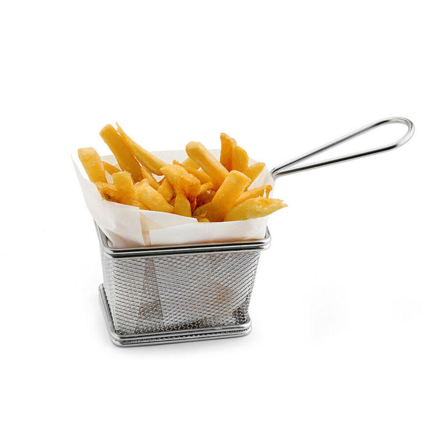 Handgeschnittene, frische Pommes frites sind die authentische Beilage zu Steaks und Burger-Spezialitäten in Gourmet-Qualität. In diesen Edelstahlkörbchen servieren Sie die Kartoffelschnitze, aber auch frittiertes Gemüse oder Meeresfrüchte portionsweise auf stilecht urbane Art. Mit fettabweisendem Pergament- oder Backpapier ausgeschlagen bleiben Korb und Tischplatte sauber. Auch direkt zum Frittieren geeignet.