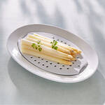 Servieren Sie Spargel oder Gemüse stilvoll und ohne Aufweichen auf dieser praktischen Servierplatte. Auch ohne Abtropfgitter eine ideale Servierplatte für Fisch, Fleisch oder Salate, um Geschmack und Konsistenz optimal zu erhalten. Hartporzellan, gebrannt bei ca. 1.400 °C, Servierplatte 36,5 x 24,5 x 3,7 cm (B/T/H), Gastronomie-Qualität, backofenfest bis 300 °C, stoßfest, mikrowellengeeignet, spülmaschinenfest.