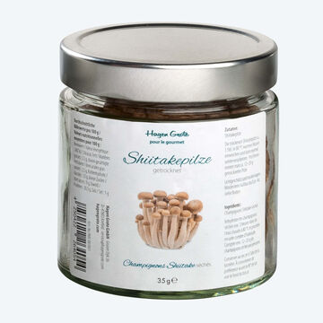 Shiitake-Pilz: Gesunder Gourmet-Pilz in herausragender Spitzenqualität Aroma und Geschmack getrockneter Pilze sind ausgeprägter als bei frischen Pilzen. Für eine Portion benötigen Sie nur 12 bis 20 g, die durch Rehydrierung (Wässern) wieder bis zu 200 g ergeben. Nur die besten Shiitakepilze werden für uns gesammelt, handverlesen und in Gläser gefüllt. Der Shiitake-Pilz überzeugt Feinschmecker mit viel Umami (der fünften Geschmacksrichtung) und seinen gesunden Eigenschaften. In der Traditionellen Chinesischen Medizin gilt er als Heilpilz. Hervorragend passen Shiitake-Pilze zu asiatischen (Wok-)Gerichten, zu Fleisch, Fisch oder Eierspeisen (Omelett, Frittata). Eingeweicht können sie im Ganzen oder klein gehackt verwendet werden, zum Beispiel als köstliche Füllung für Frühlingsrollen. Unverzichtbar in der gehobenen Küche und für Gourmets weltweit eine Delikatesse. 35 g im Aromaglas.