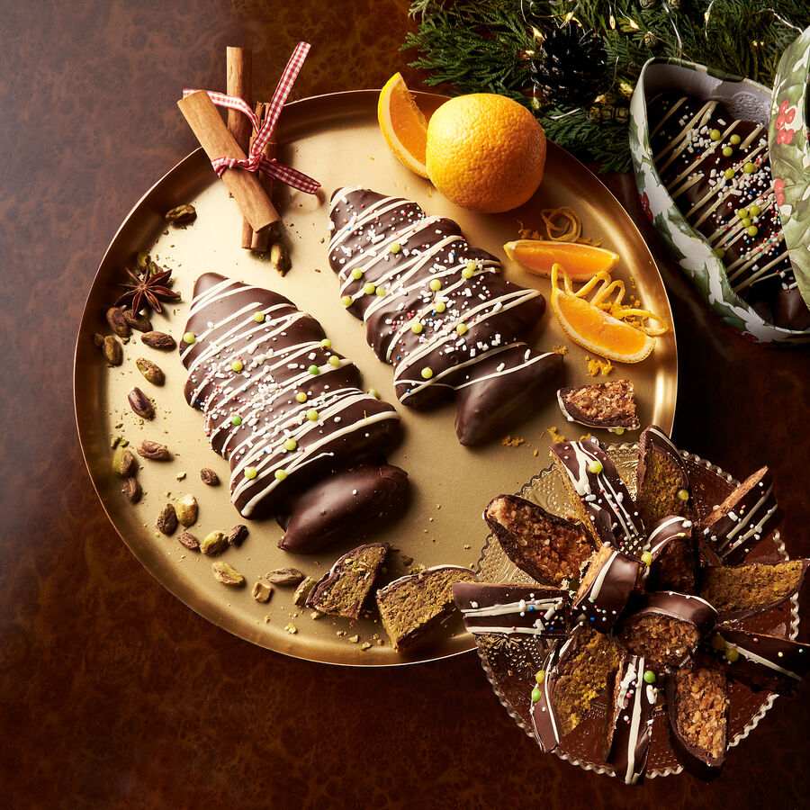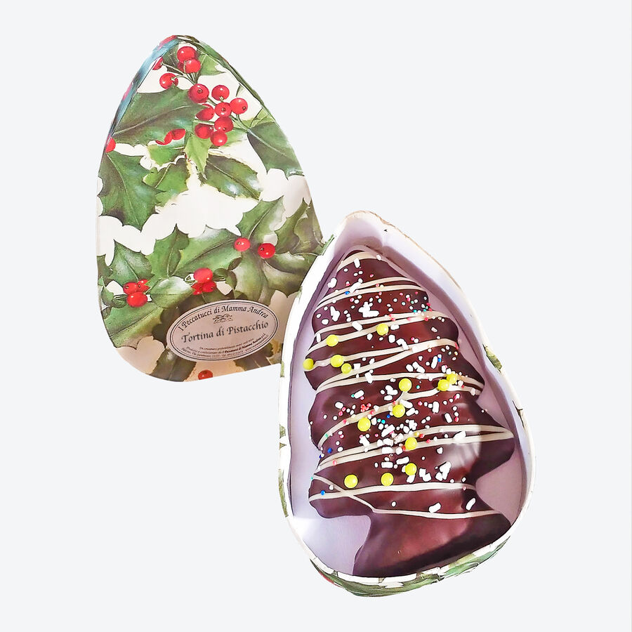 Für seine herrlichen Pistazien ist Sizilien in aller Welt bekannt. In diesem liebevoll handgefertigten Kuchen kommt ihr einmaliger, aromatischer Geschmack hervorragend zur Geltung. Mit bunten Zuckerperlen verziert erinnert das Gebäckstück an einen ausladend geschmückten Weihnachtsbaum. Feiner Pistazienkuchen mit Schokoladenüberzug (56 % Kakaoanteil). Kommt in dekorativer Box.
