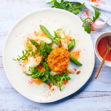 Spargelsalat mit frittiertem Ei und Piment d'Espelette-Fruchtpüree-Vinaigrette