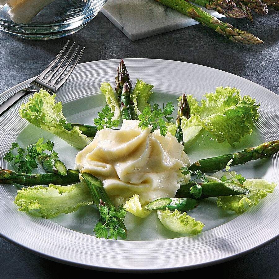 Nach dem oben beschriebenen Rezept lässt sich ebenso grüner Spargelschaum herstellen. Dafür 900 g grünen Spargel und 100 g blanchierten Blattspinat verwenden.
