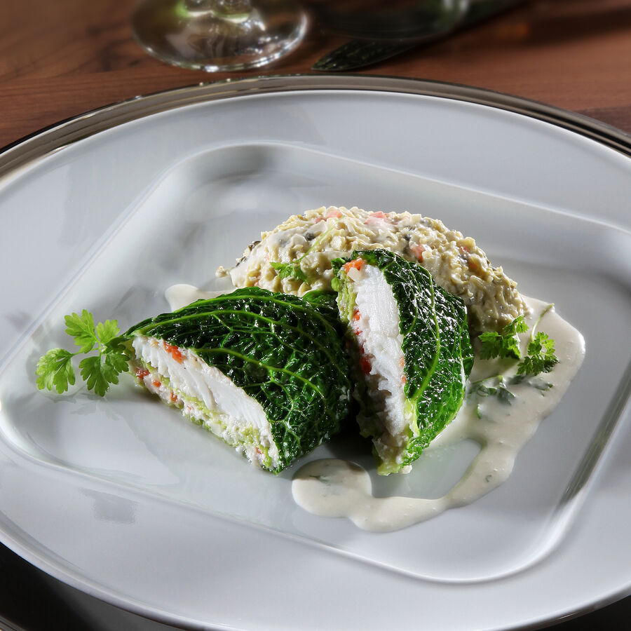 1 Aus dem Wirsing den Strunk kegelförmig herausschneiden und die Blätter abtrennen. 8 schöne große Blätter auswählen und in kochendem Wasser 3 Minuten blanchieren. Eiskalt abschrecken, trocken tupfen und die dicken Blattrippen entfernen. Die restlichen Wirsingblätter für das Wirsingpüree beiseitelegen.