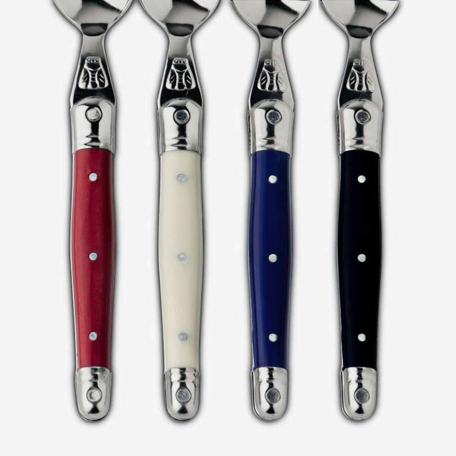 Die charakteristisch gerundeten Griffe und der typisch vernietete Schaft mit der Biene als Markenzeichen sind unverkennbar Laguiole. Seit 1892 bürgt der traditionsreiche Name aus der Auvergne für Kunstschmiedearbeit erster Güte. Das zeitlos klassische Design des Bestecks harmoniert mit jedem Geschirr und verleiht Ihrer Kaffeetafel zusätzlichen Glanz. Das scharfe Tortenmesser mit 12 x 4 cm breiter Klinge dient auch als Tortenheber. Alle farbigen Griffe passen exakt zu unserem klassischen Laguiole-Tafelbesteck.