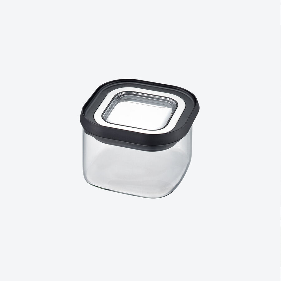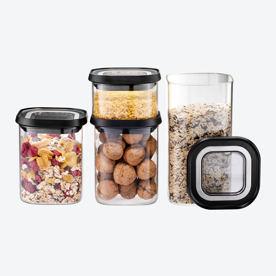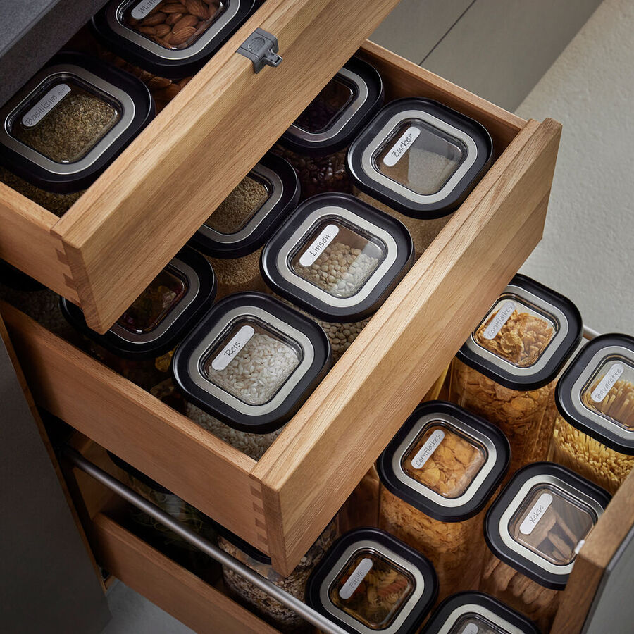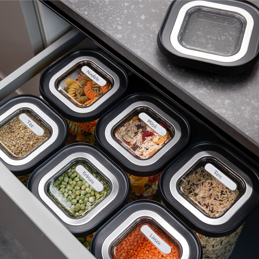 Luftdicht verschließt der Deckel dank Silikondichtung den Vorratsbehälter aus Borosilikat-Hartglas und sorgt so für aromasichere Aufbewahrung und Bevorratung. Trockene Lebensmittel wie Pasta, Müsli, Hülsenfrüchte, Zucker, Kaffee, Gewürze etc. werden darin gut sichtbar aufbewahrt, bleiben trocken, sauber und frisch. Durch die quadratische Grundfläche wird der Platz im Küchenschrank oder auf Regalen optimal genutzt. Dank Sichtfenster haben Sie bei der Lagerung auch in Schubladen immer Inhalt und Menge im Blick.