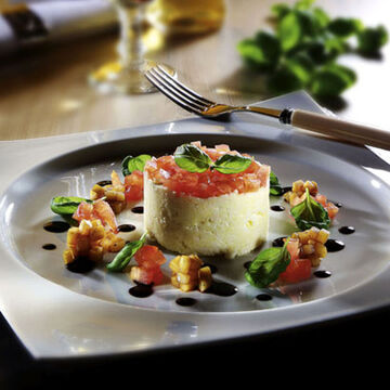 5 Das heiße Stockfischpüree auf heiße Teller in einen Vorspeisenring füllen und mit einer dünnen Schicht Tomatenconcassée bedecken. Mit Salatblättchen oder Kräutern dekorieren.