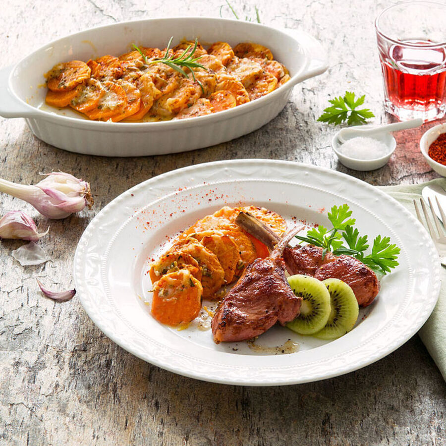• Produktbild für 'Süßkartoffel-Gratin mit Lammkoteletts und Kiwi'