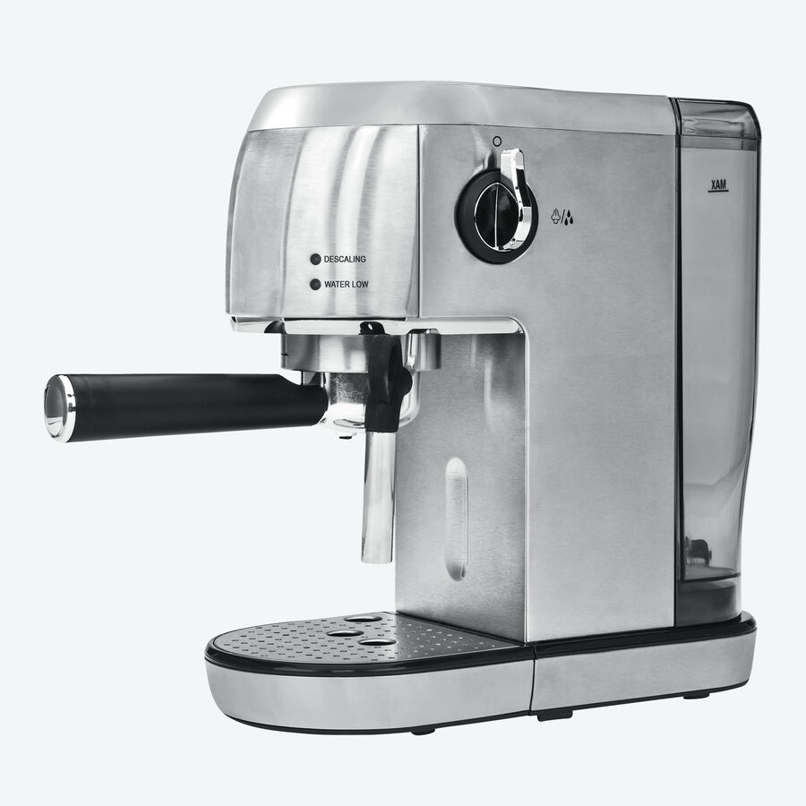 Korpus gebürsteter Edelstahl, Kunststoff, Chrom, 31 x 15 x 30 cm (B/T/H), wiegt 4,25 kg. Heißwasserauslass, abnehmbarer Wassertank 1,5 l, herausnehmbare Abtropfschale, rutschfeste gummierte Füße. 230V/1.400W, 1,05 m Anschlusskabel. Kommt mit Messlöffel, Stopfer, 2 Siebeinsätzen. Geprüfte Sicherheit.