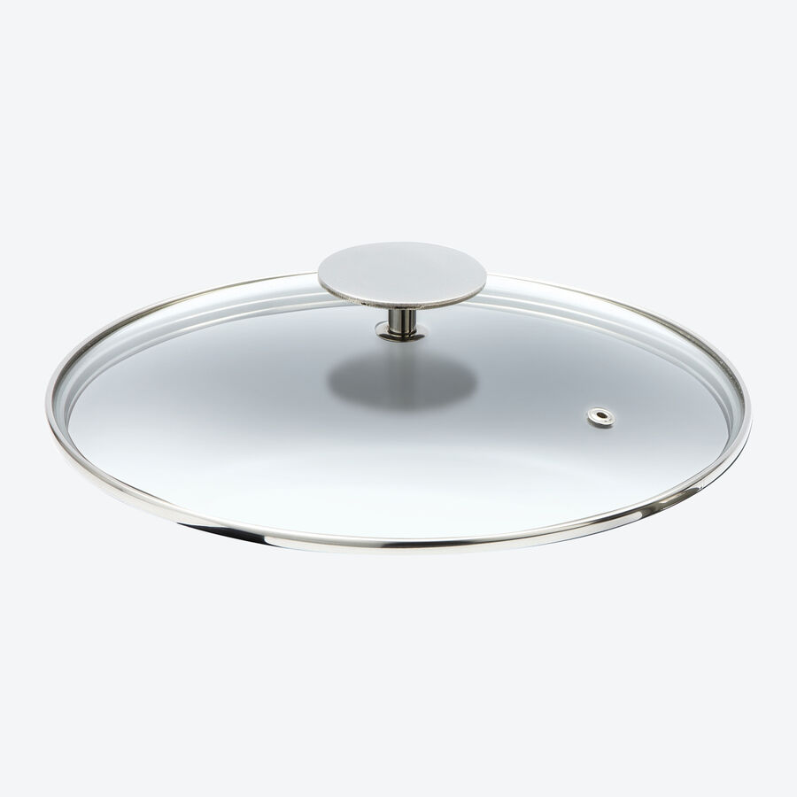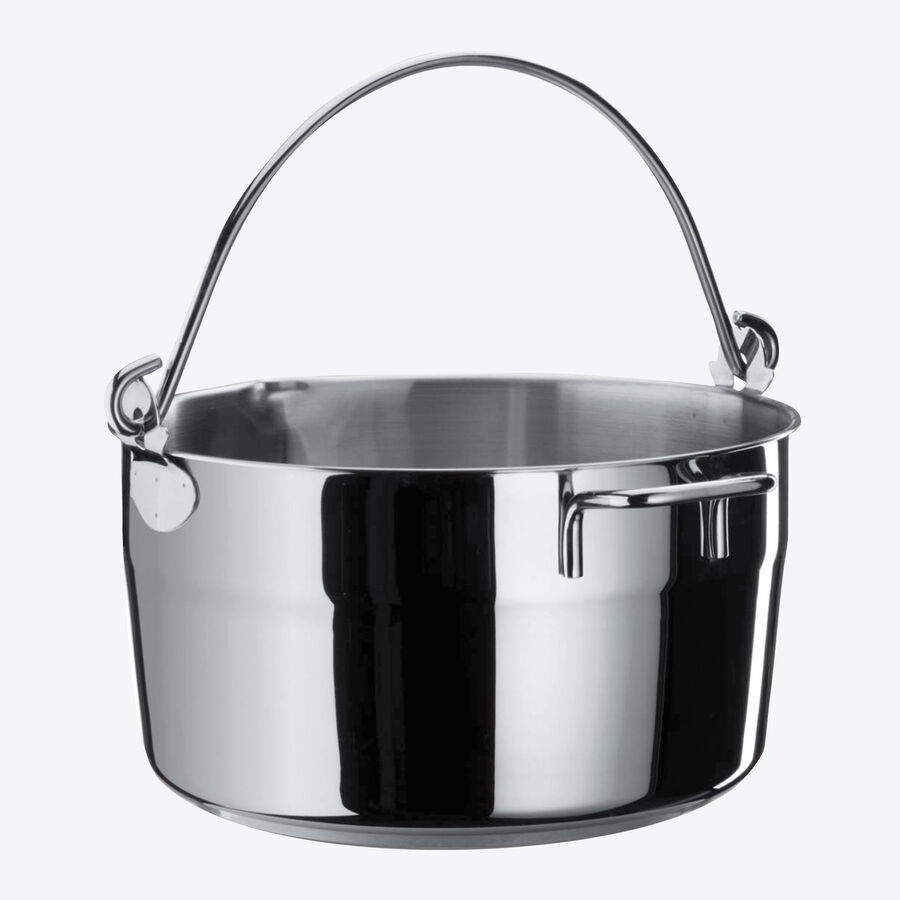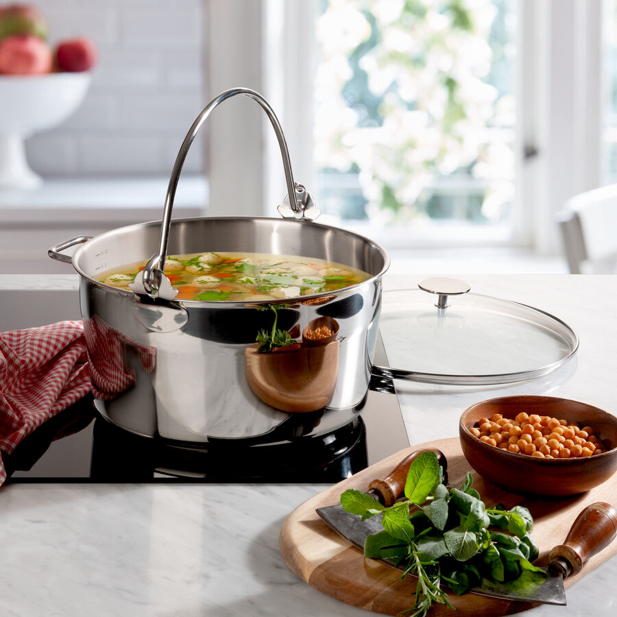 Hochglanzpolierter Edelstahl 18/10, Ø 30 cm, 16,5/33,5 cm (Höhe ohne Henkel/mit hochgeklapptem Henkel), 10,45 l, Edelstahlgriffe, Boden Ø 24 cm, Gewicht 2,2 kg (Topf), 1,14 kg (Deckel), für alle Herdarten inklusive Induktion geeignet, spülmaschinenfest.