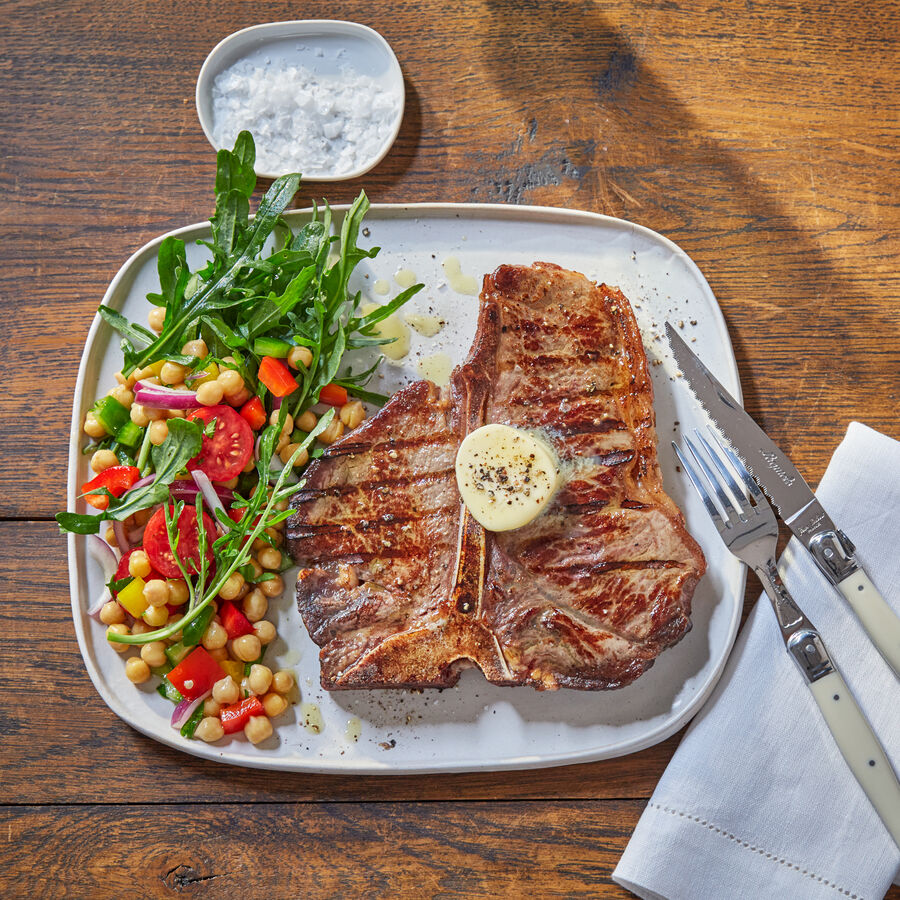 • Produktbild für 'T-Bone-Steak, Knoblauchbutter und Kichererbsensalat'