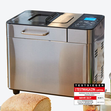 Das ETM Testmagazin kürte in Ausgabe 10/2016 diesen Brot-Backautomaten zum Sieger. Mit der Note "Sehr gut" verwies er 8 renommierte Markenhersteller auf die hinteren Ränge. Das kompakte, einfach bedienbare Gerät produziert köstliche 500 g, 750 g und 1 kg Brot-, Kuchen-, Brötchen-, Pizza- und Pastateige. Dank 18 voreingestellten Programmen (inkl. Glutenfrei- Programm) werden Zutaten automatisch gemischt, geknetet und gebacken. Ein automatisches Zutatenfach für Nüsse, Samen, Früchte und Schokoladenstücke. Produziert auch Joghurt und fruchtige Konfitüre. Mit Gratis-Zubehör wandelt sich der Automat zur vollwertigen Eis- und Sorbet-Maschine.