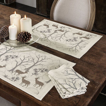 Rentiere durchstreifen den Wald, lautlos fällt der Schnee. Die ruhige Schönheit der winterlichen Natur hat die schwedische Designerin Veronica Seipel für diese hochwertige Tischwäsche meisterhaft eingefangen. Von Ekelund in Schweden, dem ältesten familiengeführten Textilunternehmen der Welt, nach patentiertem Verfahren aus dauerhafter, besonders dicht gewebter Baumwolle gefertigt.