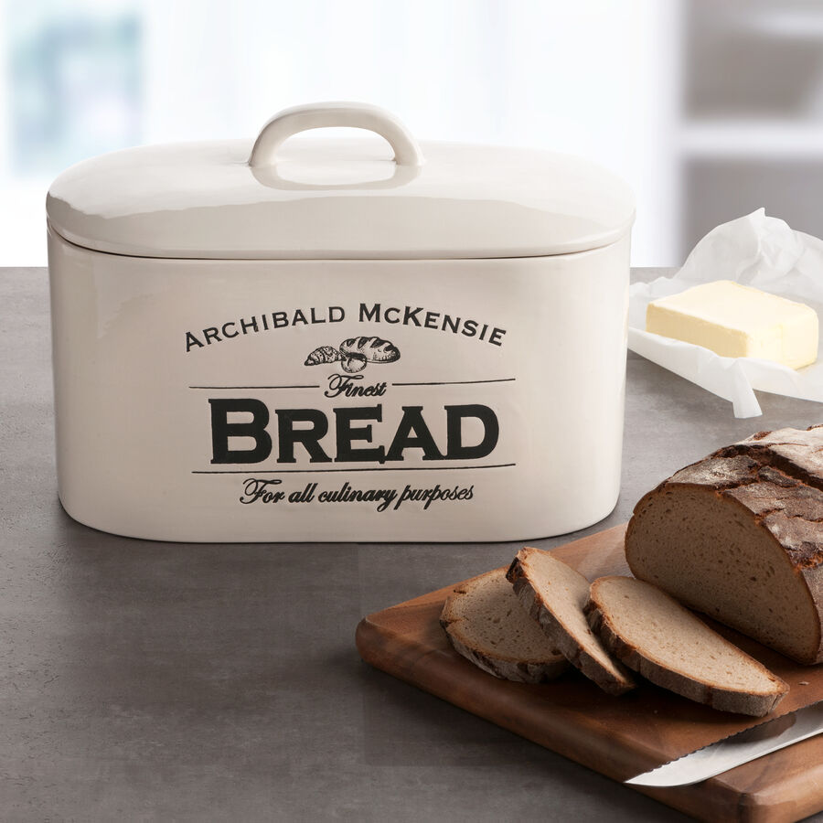 Der begabte Töpfer Archibald McKensie in Devonshire entwickelte diesen perfekten Hartkeramik-Brotbehälter für die Bedürfnisse der kleinen Haushalte auf dem Land. Dank überragender Eigenschaften gehörte dieser mit seiner praktischen, prägnanten Form schon bald zur wichtigsten Ausstattung vieler Cottage-Haushalte. Neben Brot wurden auch wichtige Grundnahrungsmittel wie Weizen oder Reis darin gelagert. Abgerundete Ecken in Kombination mit der homogenen Keramikoberfläche hemmen die Bildung von Schimmelpilzen. Gute Luftzirkulation durch den locker aufliegenden Deckel und die thermischen Eigenschaften der robusten, pflegeleichten Keramik halten Brote viel länger frisch und knusprig.
