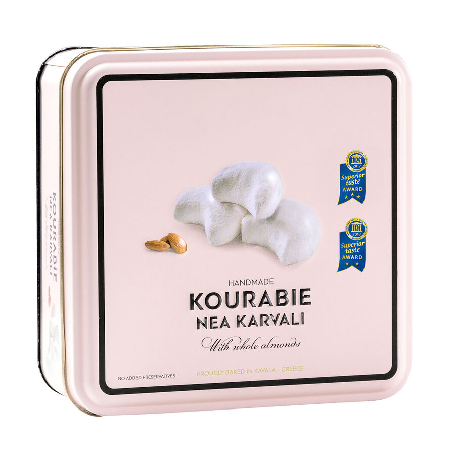 Kourabiedes wird dieses Mandelgebäck genannt, das als klassisches griechisches Weihnachtsgebäck bekannt ist. Da es so unwiderstehlich köstlich ist, genießt man es jedoch das ganze Jahr über. Nach einem über Generationen vererbten Familienrezept aus ganzen Mandeln gebacken, entfaltet sich das volle Mandelaroma in einer fein knusprigen Textur. Liebevoll wird jeder Keks von Hand geformt und nach dem Backen noch warm in Puderzucker gewälzt. Dennoch ist das Gebäck nur dezent süß. Hergestellt aus besten, rein natürlichen Zutaten, in einer 1924 gegründeten Familienkonditorei in der griechischen Hafenstadt Kavala.
