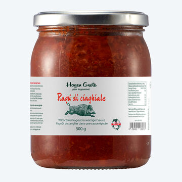 Wildschweinfleisch 60 %, Tomate, Zwiebel, Schweinefleisch 4,7 %, Wein, natives Olivenöl extra, Knoblauch, Salz, schwarze Oliven, Pfeffer, Bitterkakaopulver, Salbei, Rosmarin, Chili, Thymian.