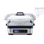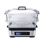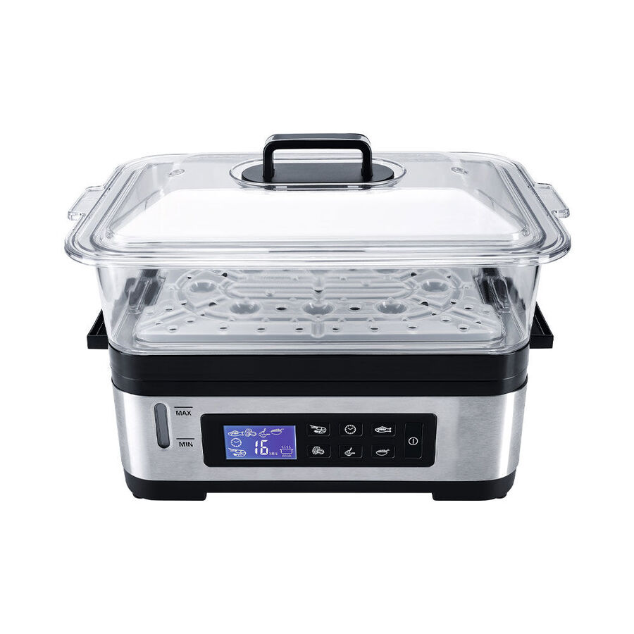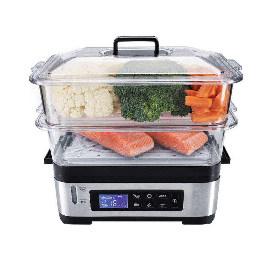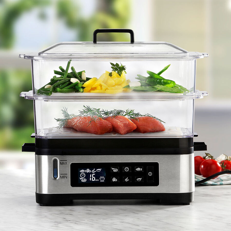 Meeresfrüchte, Fisch, Fleisch und Geflügel gelingen superzart und bleiben saftig. Lebensmittelgerechter Hartkunststoff, 30 x 22 x 31 cm (B/T/H), wiegt 2,1 kg, Böden für große Mengen herausnehmbar, Aufsätze und Einsätze Handwäsche empfohlen, 1,2 l Einsatzschale zum Reisgaren oder Warmhalten von Suppen, benutzerfreundliche LCD-Display-Bedienung, 5 wählbare Programme sowie freie Zeiteinstellung, 30-Minuten-Timer mit Signalton und Endabschaltung, 2 l Wassertank für 30 Minuten Dauerbetrieb, Wasserfüllstandanzeige, 230V/825W, 0,8 m Anschlusskabel, Lieferumfang: 2 x 3 l Dämpfaufsätze und 2 Einleger, eine Reisschale, gut verstaubar, die Einsätze passen ineinander. Geprüfte Sicherheit. Kommt mit Gartabelle.