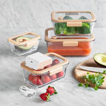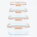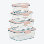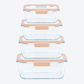 4 Vakuumdosen Borosilikatglas, Glasdeckel mit Silikondichtung, 460 ml:, 15 x 10 x 7,5 cm (B/T/H), 800 ml: 12,5 x 18 x 8 cm (B/T/H), 1,2 l: 20,5 x 15 x 8,5 cm (B/T/H), 1,9 l: 23 x 17 x 8,5 cm (B/T/H), temperaturstabil von -18 bis +300 °C (Deckel bis +80°C), mikrowellengeeignet, spülmaschinenfest (ohne Deckel).