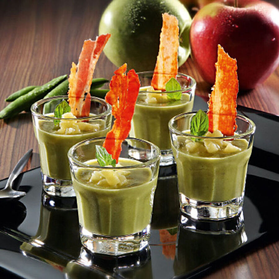 Das Süppchen in kleine Vorspeisengläser füllen. Die angebratenen Apfelwürfel auf der Oberfläche verteilen und alles mit Schinkenkrusteln und Minze garnieren.