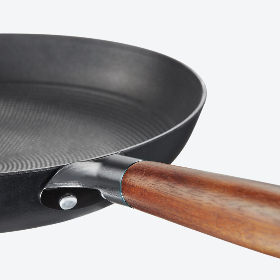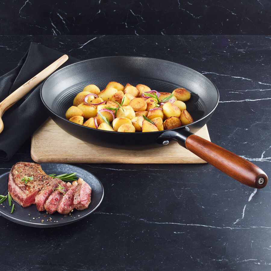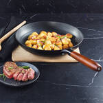 Unsere Gusseisen-Pfanne statten wir mit einer speziellen 3-fachen Wabenstruktur-Antihaftbeschichtung aus. In den winzigen Vertiefungen, die an Bienenwaben erinnern, haftet das Bratfett ganz fein über die gesamte Pfanne verteilt, statt an einer Stelle zusammenzulaufen. Dank hervorragender Wärmeleiteigenschaften des hochwertigen Gusseisens ist die Dosierung der Hitze perfekt steuerbar. Alles brät mit weniger Fett wesentlich gleichmäßiger. Fleisch entwickelt beim Anbraten in dieser Pfanne wunderbar aromatische Krusten. Ebenso gelingen darin knusprige Bratkartoffeln oder schonend gegarte Schmorsaucen für Pastagerichte.