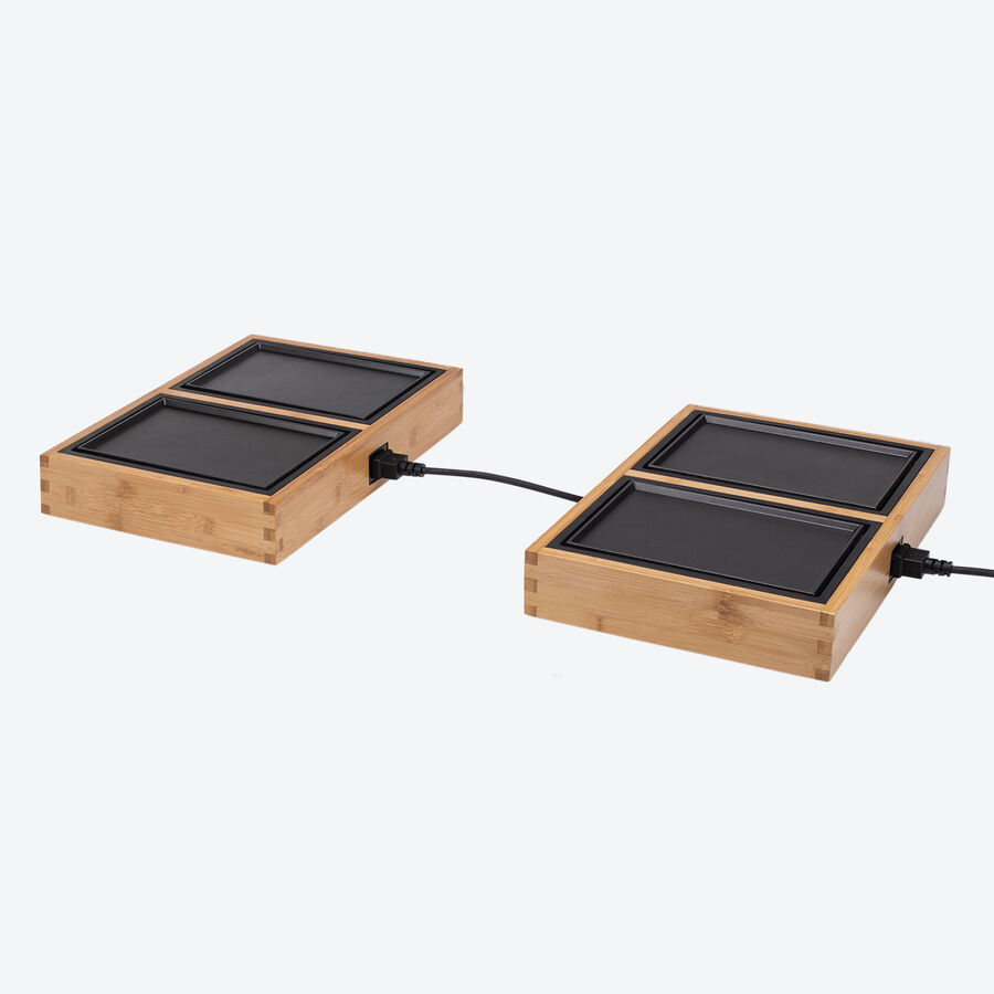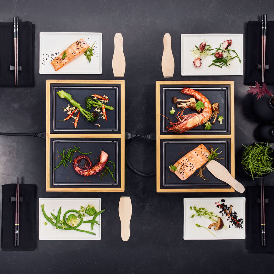 Dank mitgelieferter Steckverbindung lässt sich der 4 Personen Teppanyaki Tischgrill (2 x 2 Einheiten) einfach für eine große, gemütliche Grillrunde bis zu 8 Personen erweitern. Jede Einheit verfügt über abnehmbare Aluminium Druckguss Grill- und Porzellan-Servierplatten. In kurzer Zeit erreichen die Grillplatten 230°C Maximaltemperatur. Empfindliches Grillgut gart darauf mit wenig oder ganz ohne Fett.