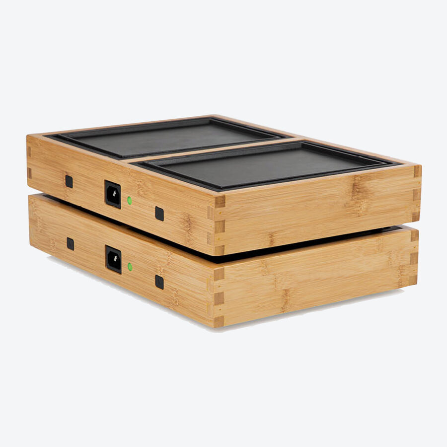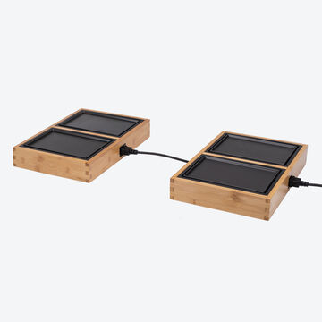 Bambus Korpus, 60 x 24 x 34 cm (B/T/H), wiegt 3,6 kg. Aluminiumguss-Grillplatten, 2-fach antihaftbeschichtet, Porzellan-Servierplatten, jeweils 21 x 14 cm (B/T), 230V/840W, 50 cm Steckverbindung, 2 m Anschlusskabel.