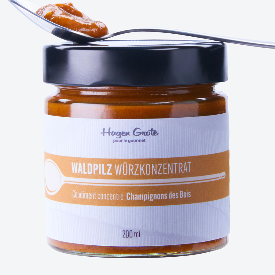 Basis dieses einzigartigen Würzkonzentrats sind die köstlichen Aromen von erlesenen Waldpilzen. Champignons und Steinpilze werden schonend getrocknet. Superfein vermahlen setzen wir in unserer Delikatessen-Manufaktur Flüssigkeit zu. In vielen Stunden sanfter Reduktion extrahieren wir die überaus geschmackvollen Pilzaromen von intensiver Würzkraft. Zwiebeln, Knoblauch sowie feine Kräuter und Gewürze wie Thymian, Lorbeer, Paprika und Pfeffer unterstreichen die herrlichen Waldpilzaromen. Absolut tabu sind im Gegensatz zu Industrieprodukten die üblichen Geschmacksverstärker, Farb- und Konservierungsstoffe oder Glutamate/Hefeextrakte. Verfeinert Bratensaucen, Pasta- und Wildgerichte, Suppen, Ragouts. Ein bis zwei Teelöffelchen des pastösen Konzentrats sorgen für eine wundervolle Geschmacksfülle.