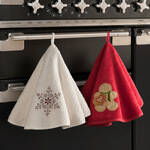 Flauschig fest und überaus saugfähig sind die Frottee-Rundtücher, die wir in Südfrankreich für Sie fertigen. Aus praktischen Gründen platzieren wir, wie in der professionellen Gastronomie erprobt, den Tuchaufhänger in die Mitte. So steht durch eine leichte Drehung die gesamte Frotteefläche zum raschen Händetrocknen während der Arbeit zur Verfügung. Mit aufwendiger Stern-Stickerei auf dem cremefarbenen Tuch entsteht Weihnachtsstimmung in der Küche.