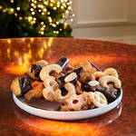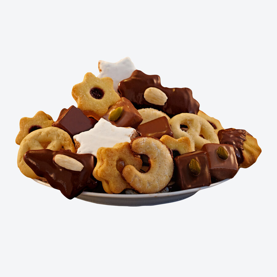 Weizenmehl, Butter, Zucker, Premium Marzipan (Mandeln, Zucker, Wasser, Invertzuckersiruppulver, Feuchthaltemittel (Sorbitsirup), Ethanol), Puderzucker, Zartbitter-Kuvertüre 60% Kakaoanteil (Kakaomasse, Zucker, Kakaobutter, Emulgator (Sojalecithine), Vanilleextrakt), Mandeln, Haselnüsse, Vollmilch-Kuvertüre 38% Kakaoanteil (Zucker, Kakaobutter, Vollmilchpulver, Kakaomasse, Emulgator (Sojalecithine), Vanilleextrakt), Kartoffelmehl, Honig, Butterreinfett (Butterreinfett, Farbstoff (Beta-Carotin)), Pistazienkerne, Apfel-Fruchtfüllung (Äpfel, Zucker, Glukose-Fruktosesirup, Apfelsaftkonzentrat, Geliermittel (Pektin), Säuerungsmittel (Citronensäure), Färbendes Lebensmittel (Zitronenkonzentrat, Färberdistelblütenkonzentrat), Zimt, Aroma), Roggenmehl, Invertzuckercreme (Invertzucker aus Saccharose, Glukosesirup aus Weizen, Honig), Margarine (Pflanzenfett aus Sheabutter, Wasser, Pflanzenfett aus Kokosfett, Pflanzenöl aus Sonnenblumenöl, Zitronenkonzentrat, Speisesalz), Sauerkirsch-Konfitüre (Sauerkirschpüree, Zucker, Glukose-Fruktosesirup, Zitronensaftkonzentrat, Geliermittel (Pektine)), nat.Aroma, Marzipanrohmasse (Mandeln, Zucker, Wasser, Invertzuckersirup), Weizenmalzmehl, Hühnervollei, geröstete Haselnüsse, Salz, Zimt, Hühnereieiweißpulver, Schlagsahne (Schlagsahne, Verdickungsmittel (Carrageen)), Lebkuchengewürz (Koriander, Zimt, Nelken, Anis, nat. Aroma), Vanilleschoten
