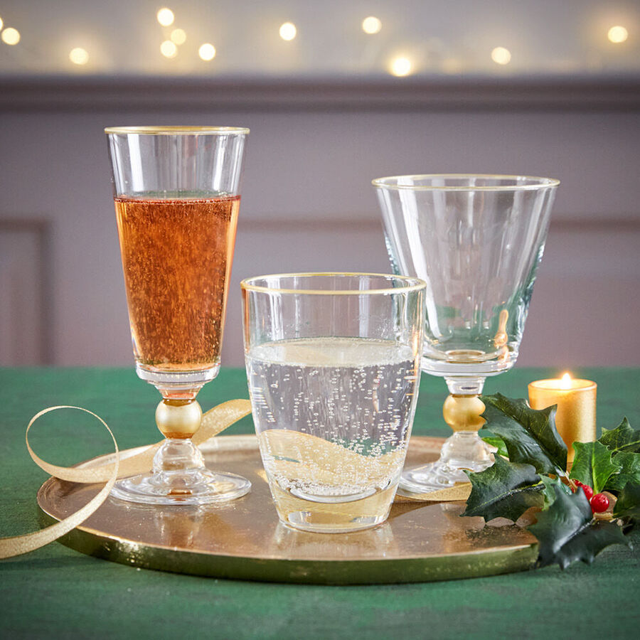 Das Weinglas der festlichen Glasserie Rubens ergänzt mit Wasser- und Sektgläsern edles Porzellan bei Tisch und glänzt beim Aperitif oder einer Feier. Die dekorativen Gläser sind mit einem feinen goldfarbenen Rand geschmückt, das passende Sektglas wie das Weinglas in Kelchform mit organisch geformtem Stiel mit eingelassener goldfarbener Kugel. Da das Dekor spülmaschinenfest ist, ersparen Sie sich nach einem gelungenen Fest das mühsame Spülen mit der Hand und überlassen die Reinigung der Gläser Ihrer Spülmaschine. Stilvolle, pflegeleichte Glasserie für den Alltag oder elegant zu jedem Anlass.